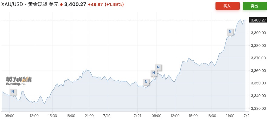 周一美盘交易时段,现货黄金突破3400美元/盎司,为6月17日以来首次,日内大涨近1.5%。因美元和美债收益率在贸易谈判存在不确定性的背景下走弱,美国规定各国必须在8月1日的最后期限之前达成协议,否则将面临更多关税,使得避险情绪升温。