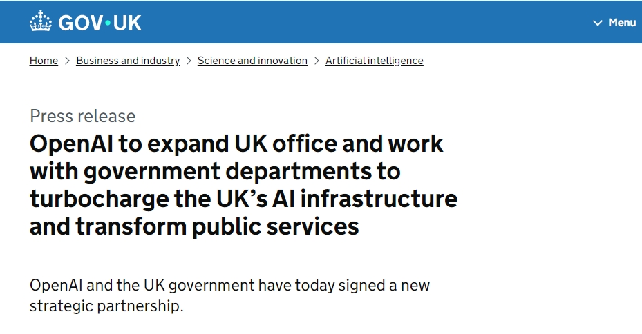 ①英国政府与OpenAI签署战略合作伙伴关系,合作领域包括AI安全研究、基础设施投资等;②OpenAI将扩大伦敦办公室规模,并考虑投资数据中心等AI基础设施,同时向英国AI安全研究所共享技术细节。