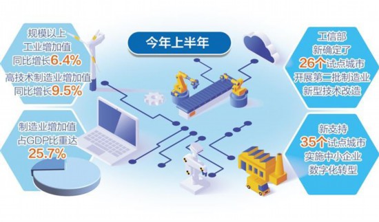国家统计局最新数据显示,今年上半年,规上工业增加值同比增长6.4%,在一季度良好开局的基础上展现出较强韧性,制造业增加值占GDP比重达25.7%,基本保持稳定。