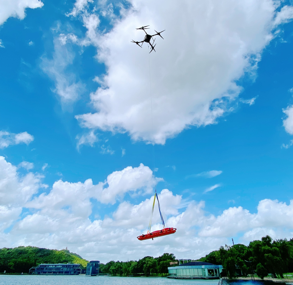 在水上应急救援领域,无人机空投救生圈、充气垫造型的无人机自主起飞并降落到水面进行施救的表演让人眼界大开。安徽天机翼无人机载重量达到150公斤,可将一副担架稳稳提起进行低空转运;还有一架最新款FC-30氢电版运载无人机,其最大优势就是长续航,在飞行展示中,它全程悬停在空中,展示了续航实力。