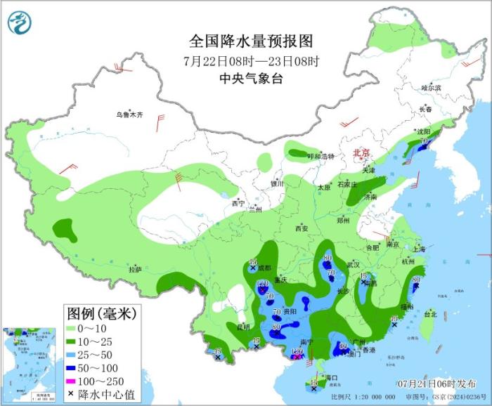 图4 全国降水量预报图(7月22日08时-23日08时) 图片来源:中央气象台网站