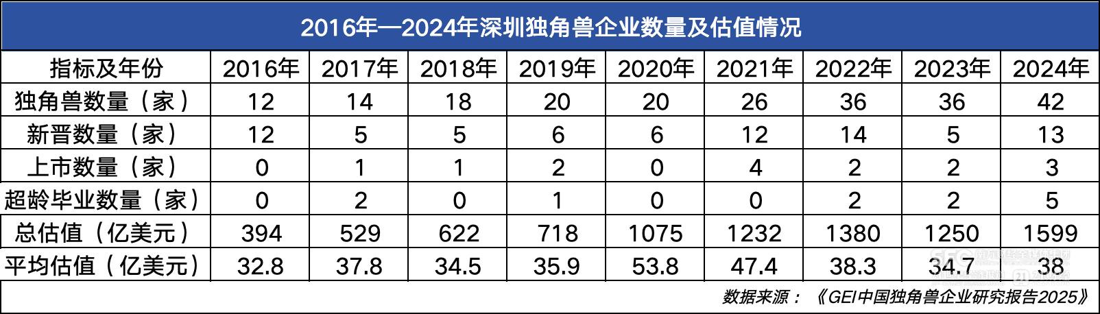 时隔12年,深圳已然成为培育硬科技独角兽企业的沃土。根据《GEI中国独角兽企业研究报告2025》(简称《报告》),2024年中国独角兽企业372家,其中,深圳独角兽企业42家,总估值1599亿美元,平均估值37.1亿美元;新晋独角兽企业13家,数量全国第一,占全国新晋独角兽企业总量的四分之一。