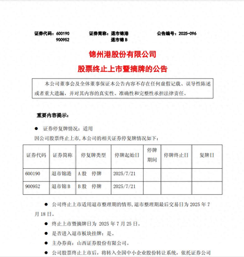 根据《上海证券交易所股票上市规则》的相关规定及安排,上海证券交易所将在2025年7月25日对退市锦港股票予以摘牌,公司股票终止上市。