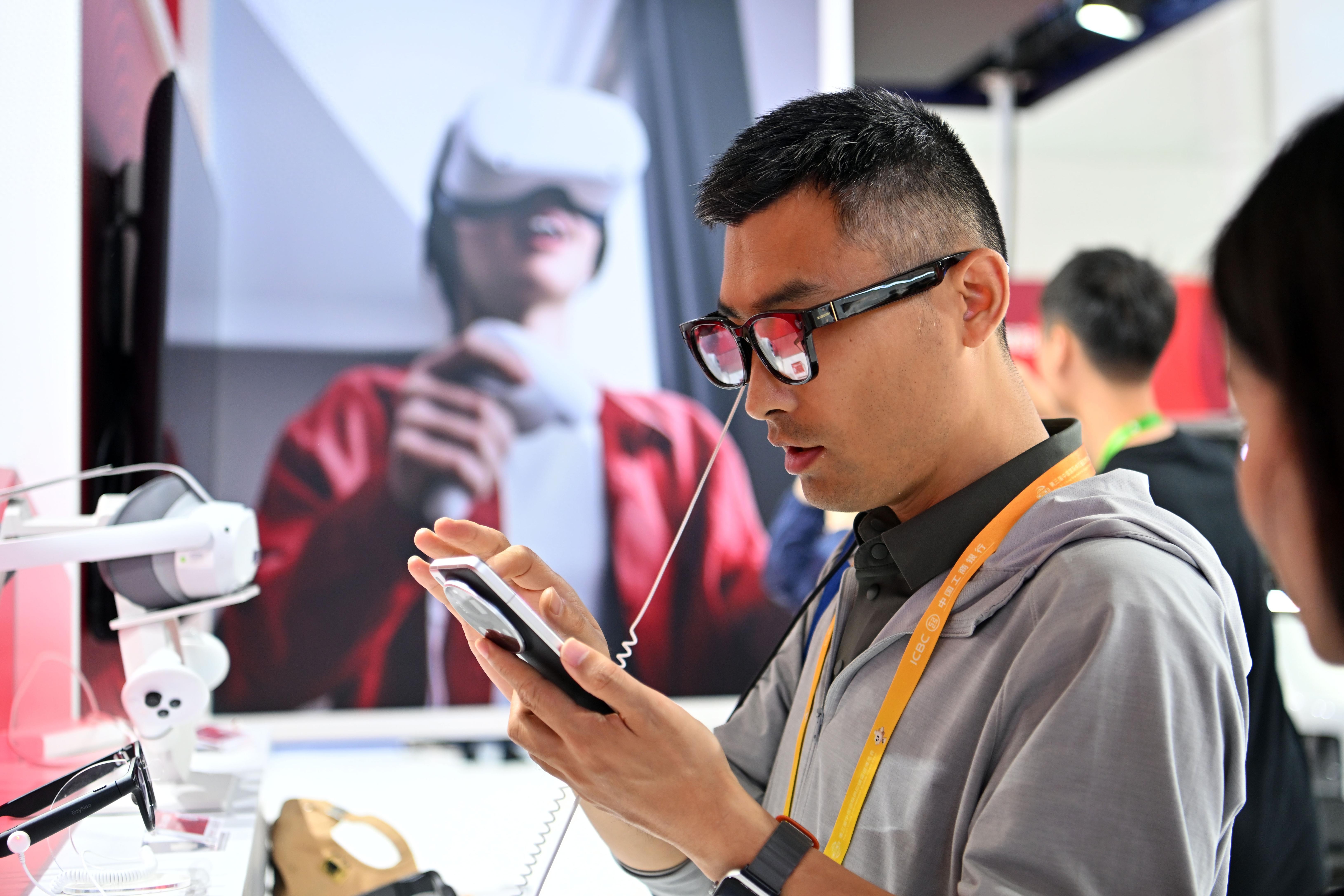 7月17日,在数字科技链展区的高通展台,参观者体验小米AI眼镜。人民网记者 翁奇羽摄