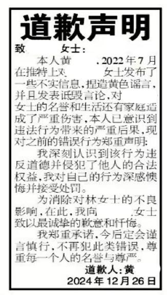 2024年8月,二审法院经审理认为上诉理由缺乏法律依据,裁定驳回上诉、维持原判。判决生效后,黄某在15天履行期内仍未履行义务。随后,苏雨晴依法向兴宁区法院执行局申请强制执行。2024年12月26日,黄某终于刊登致歉声明。
