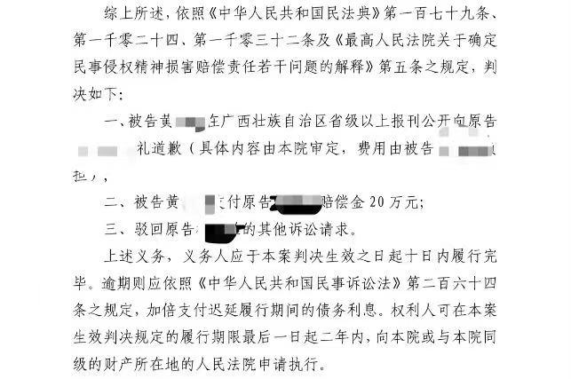 2024年5月,南宁市兴宁区人民法院对该人格权纠纷案作出一审判决。经审理查明,被告黄某在推特、微信、微博等平台发布苏雨晴照片及微信名片,并散布不实信息,构成侵权。依据《中华人民共和国民法典》相关规定,法院判决黄某在广西壮族自治区省级以上报刊公开赔礼道歉,并赔偿苏雨晴20万元。