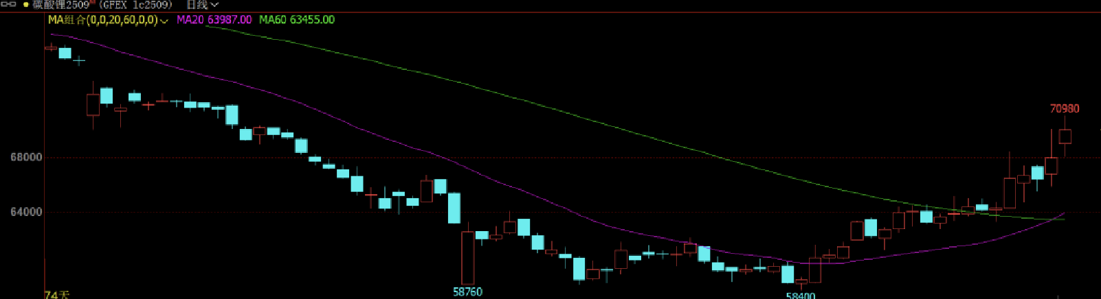 本周,碳酸锂期货价格呈现持续上涨态势。7月18日,碳酸锂期货主力合约LC2509盘中突破70000元/吨,随后小幅回落。截至收盘,LC2509报69960元/吨,上涨2.82%。