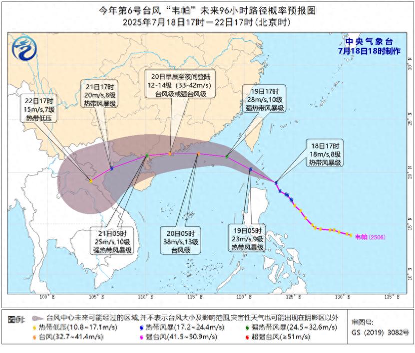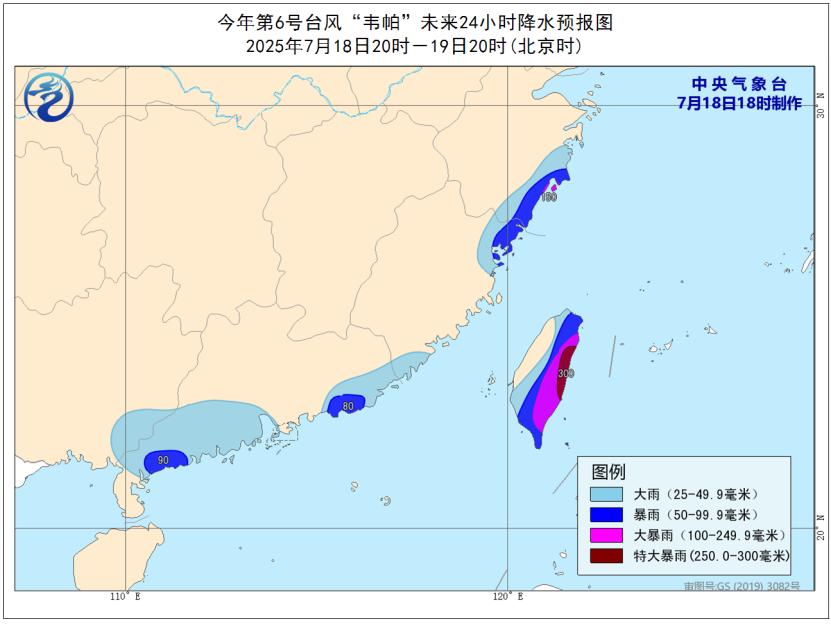 降水预报:7月18日20时至19日20时,浙江东南部沿海、福建东北部和东南部沿海、广东西部和南部沿海、广西东南部、台湾岛大部等地部分地区有大到暴雨,其中,台湾岛东部部分地区有大暴雨,局地特大暴雨(250~300毫米)。上述部分地区伴有短时强降水(最大小时降雨量20~50毫米,局地可超过70毫米),局地有雷暴大风等强对流天气。