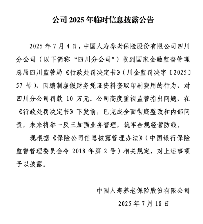 7月18日,中国人寿养老保险股份有限公司发布公告称,2025年7月4日,中国人寿养老保险股份有限公司四川分公司(以下简称“四川分公司”)收到国家金融监督管理总局四川监管局《行政处罚决定书》,因编制虚假财务凭证资料套取印刷费用的行为,对四川分公司罚款10万元。公司高度重视监管指出问题,在《行政处罚决定书》下发前,已完成全面彻底整改和内部问责,未来将举一反三加强业务管理,筑牢合规经营防线。