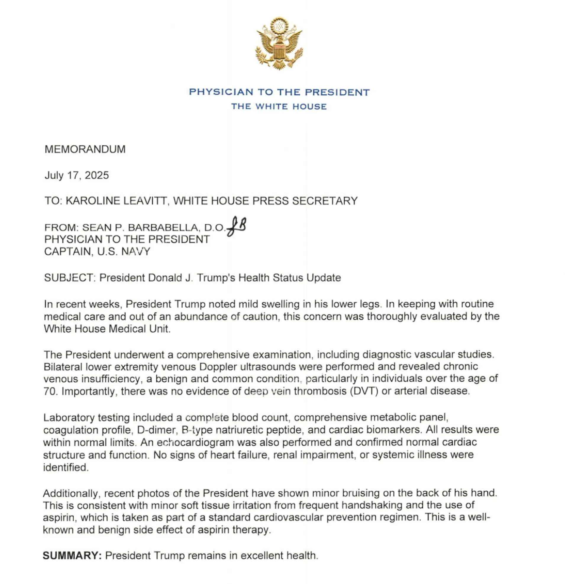 莱维特回应称,特朗普最近几周已注意到肿胀,并接受了白宫医疗部门的全面评估。结果显示,他患有一种常见的静脉疾病,但没有患上更严重的疾病。