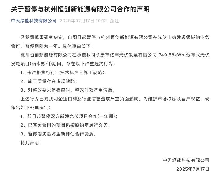 7月17日,中天绿能科技有限公司发布声明称,经公司慎重研究决定,自即日起暂停与杭州恒创新能源有限公司在光伏电站建设领域的业务合作,暂停期限为一年。暂停期满后将重新评估合作资质。已签署合同的项目仍按原约定履行义务。中天绿能称,杭州恒创新能源有限公司在承接公司永康市亿丰光伏发展有限公司749.58kWp分布式光伏发电项目(丽水熙和)期间,存在以下严重违约行为:未严格执行行业技术标准与施工规范;施工质量存在多项缺陷;对整改要求消极应对,整改时效严重滞后。