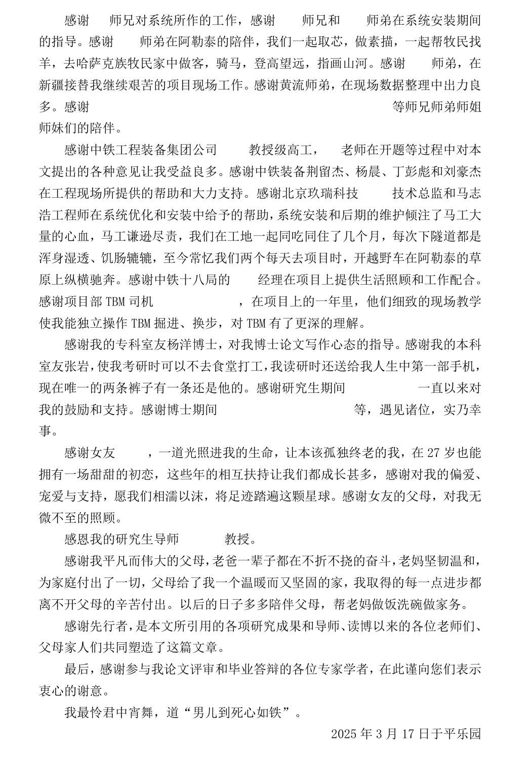 致谢中,作者感谢了导师、课题组老师、同学、同事,专科、本科室友及女友等人,其中提到了本科室友对他的帮助,“使我考研时可以不去食堂打工,读研时还送给我人生中第一部手机,现在仅有的两条裤子有一条还是他的。”