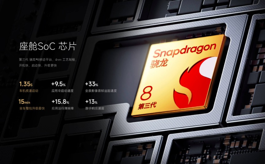 消费级芯片“上车”,其实并不少见。比如,当前热度较高的某款新车座舱SoC芯片来自第三代骁龙®8移动平台,即骁龙8 Gen 3芯片,主要搭载于手机等电子产品上。