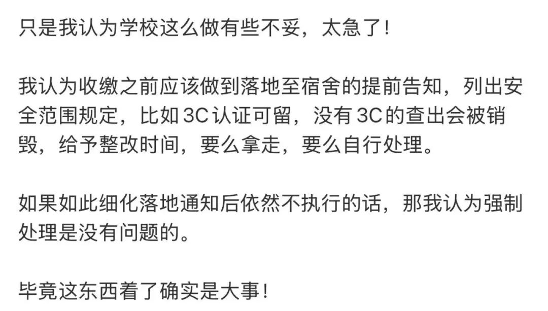 此外,国家并未发文明确指出充电宝属于违规电器,仅规定不能携带无3C认证的充电宝乘坐飞机。学校对所有充电宝一律收缴,这种做法属于“一刀切”,“程序上也不太合法”。