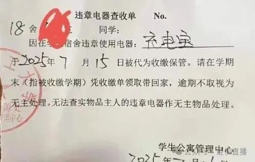 徐汇校区学生爱音(化名)表示,有学生收到了“违章电器查收单”,显示学生“因在学生宿舍违章使用电器充电宝,于2025年7月15日被代为收缴保管。”该查收单落款单位为学生公寓管理中心,落款时间为2025年7月15日。