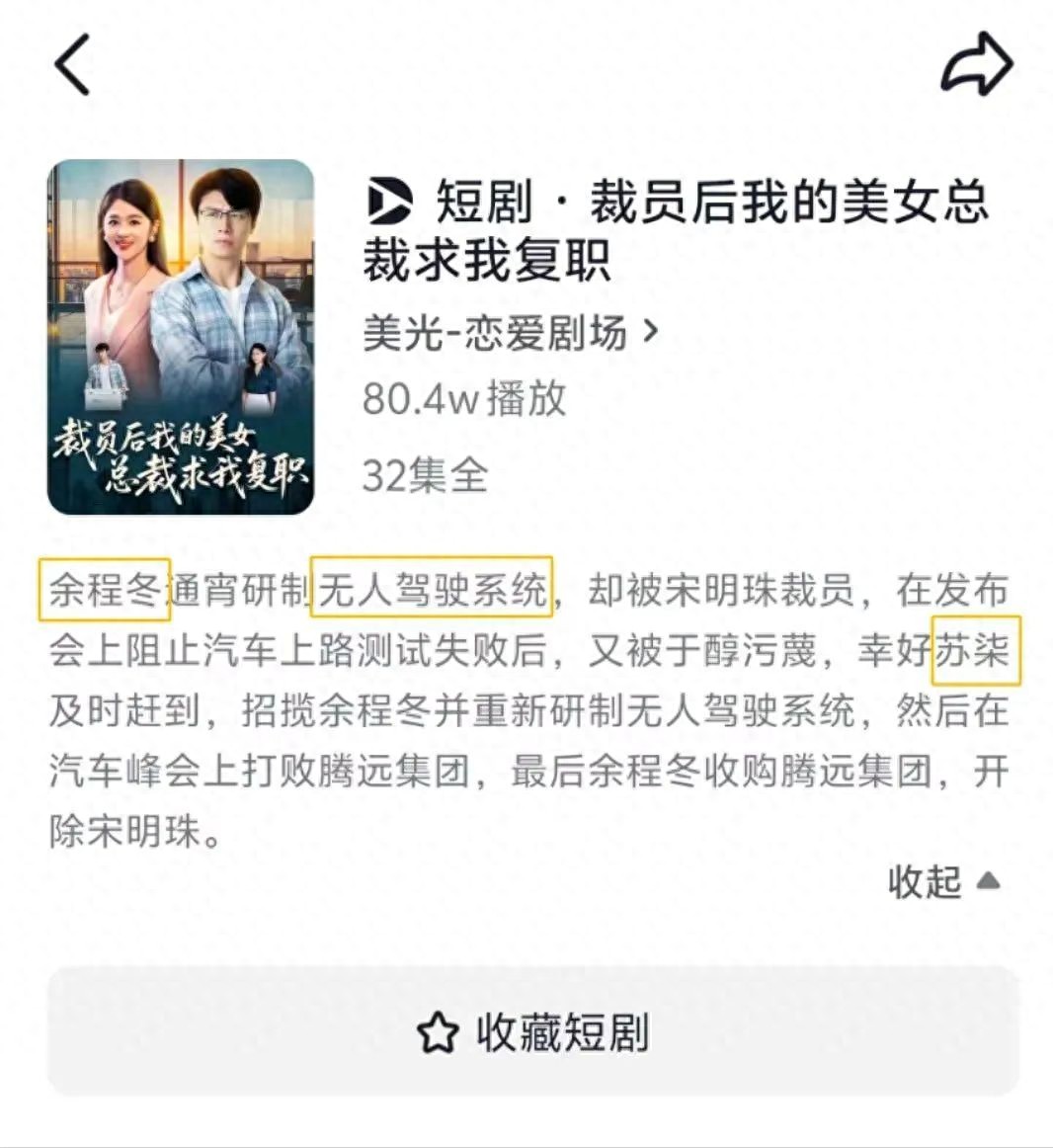 例如,余程冬名字与华为高管余承东高度相似、骁米集团名称似小米集团、苏柒角色名音同小米SU7车型。短剧中还涉及无人驾驶车辆一旦上路行驶30秒,系统就会失控崩溃的情节,引发公众联想。目前,两部短剧累计播放量分别为80.4万次、1.7亿次。