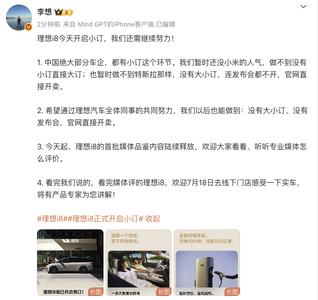 7月17日上午,理想汽车CEO李想宣布,理想i8正式开启小订。“中国绝大部分车企,都有小订这个环节。我们暂时还没小米的人气,做不到没有小订直接大订;也暂时做不到特斯拉那样,没有大小订,连发布会都不开,官网直接开卖。”李想表示,希望通过理想汽车全体同事的共同努力,以后也能做到:没有大小订、没有发布会,官网直接开卖。