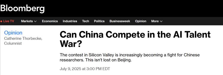 美国彭博新闻社的一篇文章从人才培养与吸引力角度分析中国人工智能产业发展潜力。文章指出,全球人工智能竞赛的关键驱动力是一场对中国技术人才的激烈争夺,在全球顶尖人工智能研究人员中,有约一半来自中国,仅有18%来自美国。哈佛大学和斯坦福大学的研究人员都表示,中国在“人工智能人才资源原生力量”方面处于主导地位,推动了中国本土研究的可持续发展,以深度求索为例,其团队中有一半成员从未离开过中国接受教育或从事工作。