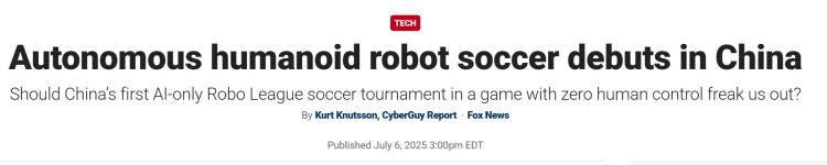 美国福克斯新闻网还关注到近日举办的一场“充满未来感”中国首届由人工智能驱动的人形机器人足球赛。报道指出,这场赛事标志着中国在人工智能现实应用中的一个重要里程碑,完全实现了“零人类干预”。尽管这些机器人的步伐还稍显笨拙,但整场比赛过程中,机器人能够自主运行,独立行动,并通过人工智能和传感器作出实时决策,让世界得以管窥人工智能和机器人技术的发展方向,也预示着智能机器在人类未来日常生活中可能扮演的角色。