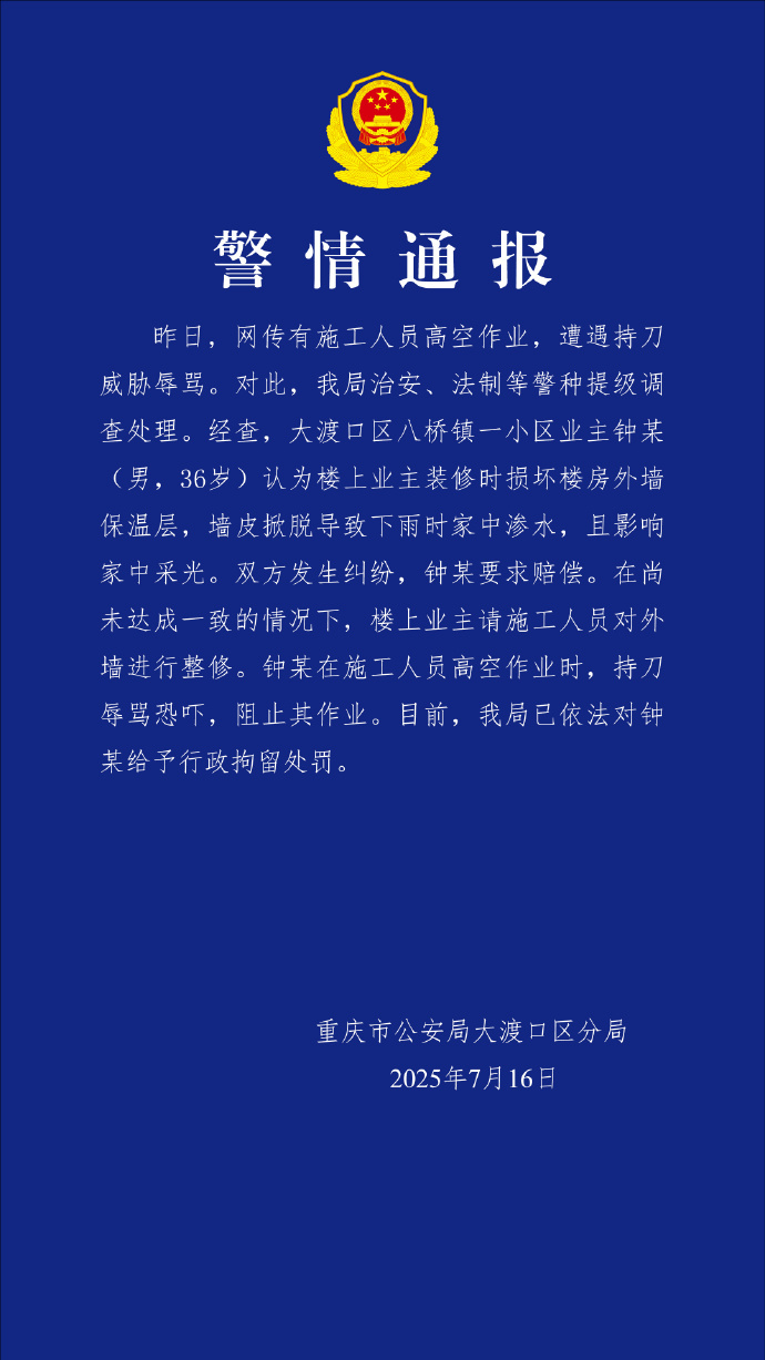 施工人员高空作业时遭业主持刀威胁辱骂?重庆警方通报