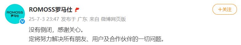 7月3日晚,罗马仕官方发文称:“没有倒闭,感谢关心。定将努力解决所有朋友、用户及合作伙伴的一切问题。 ”