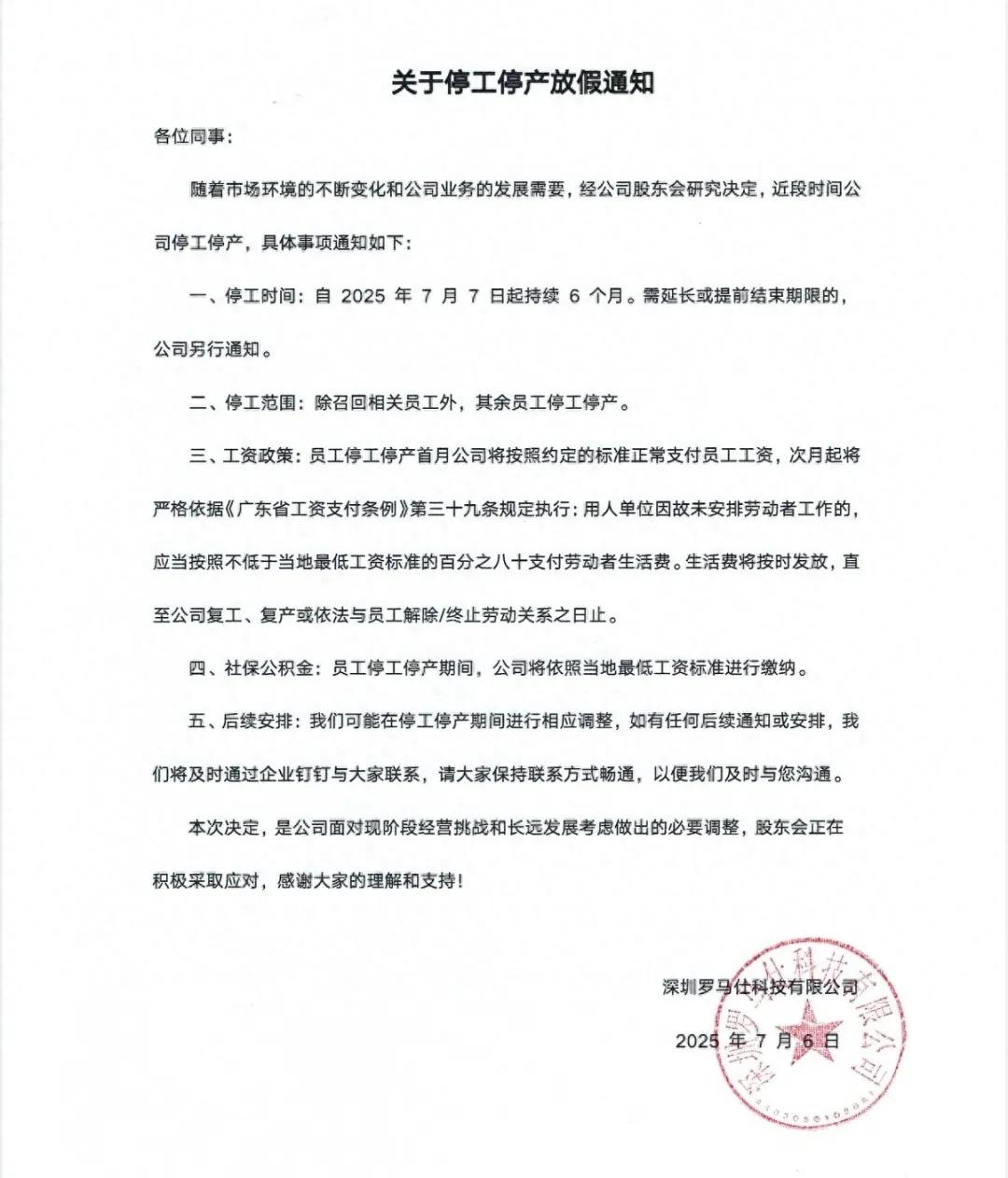 通知中指出,停工时间为自2025年7月7日起持续6个月。除召回相关员工外,其余员工停工停产。这期间,员工停工停产首月,公司将按照约定的标准正常支付员工工资,次月起将依据当地最低工资标准的80%支付劳动者生活费。