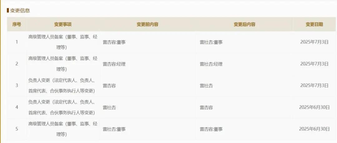 7月2日,罗马仕公司发生工商变更,国家企业信用信息公示系统显示,深圳罗马仕科技有限公司发生负责人变更及高级管理人员备案,雷社杏卸任法定代表人、董事、经理职务,由雷杏容接任。雷社杏在今年4月任罗马仕法定代表人、董事,距此次变更不足三个月。