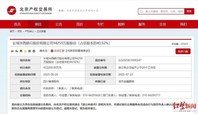 据微成都6月30日报道,北京产权交易所信息显示,长城华西银行约9.42亿股股权(占总股本的40.92%)在该所挂牌转让,转让底价达43.32亿元。