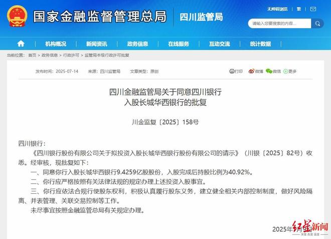 7月14日,国家金融监督管理总局四川监管局发布《四川金融监管局关于同意四川银行入股长城华西银行的批复》,经审核,同意四川银行入股长城华西银行9.4259亿股股份,入股完成后持股比例为40.92%。