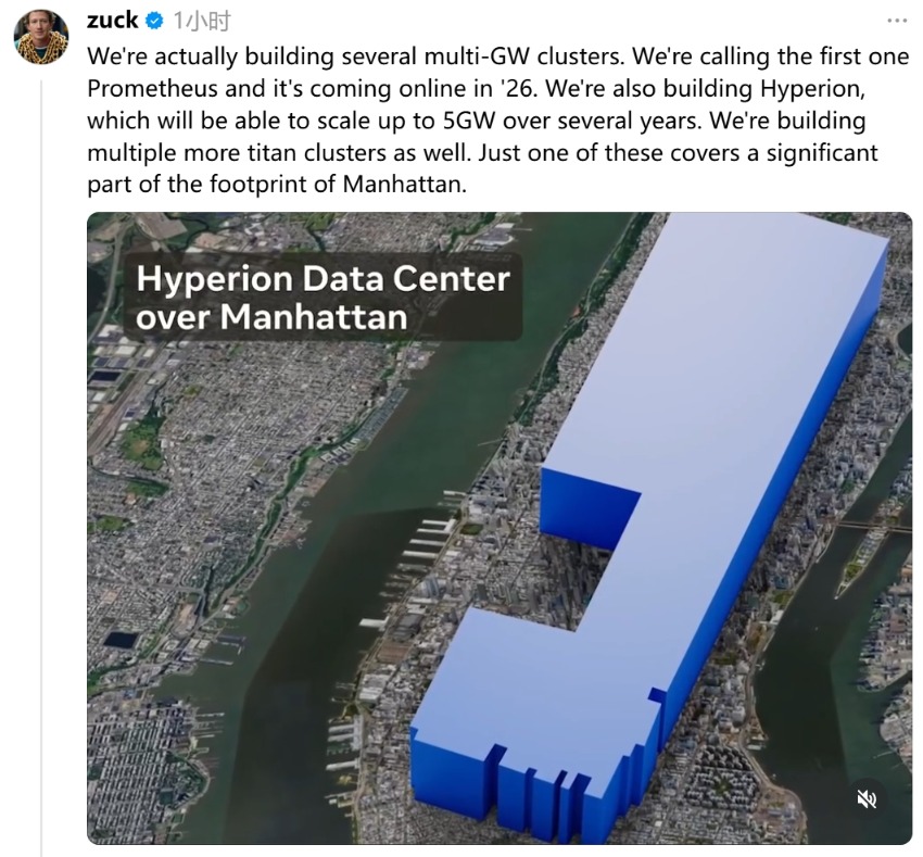 他在社交媒体上发文表示,Meta正在建设多个“吉瓦”级别的数据中心集群,其中包括预计在2026年上线的首个集群“普罗米修斯”(Prometheus),同时另一个名为“海伯里安”(Hyperion)的集群也在建设中,预期将在几年内扩展到5吉瓦规模。作为参考,美国最大核电站沃格特勒核电站,四个机组的发电能力之和约为4.5吉瓦。