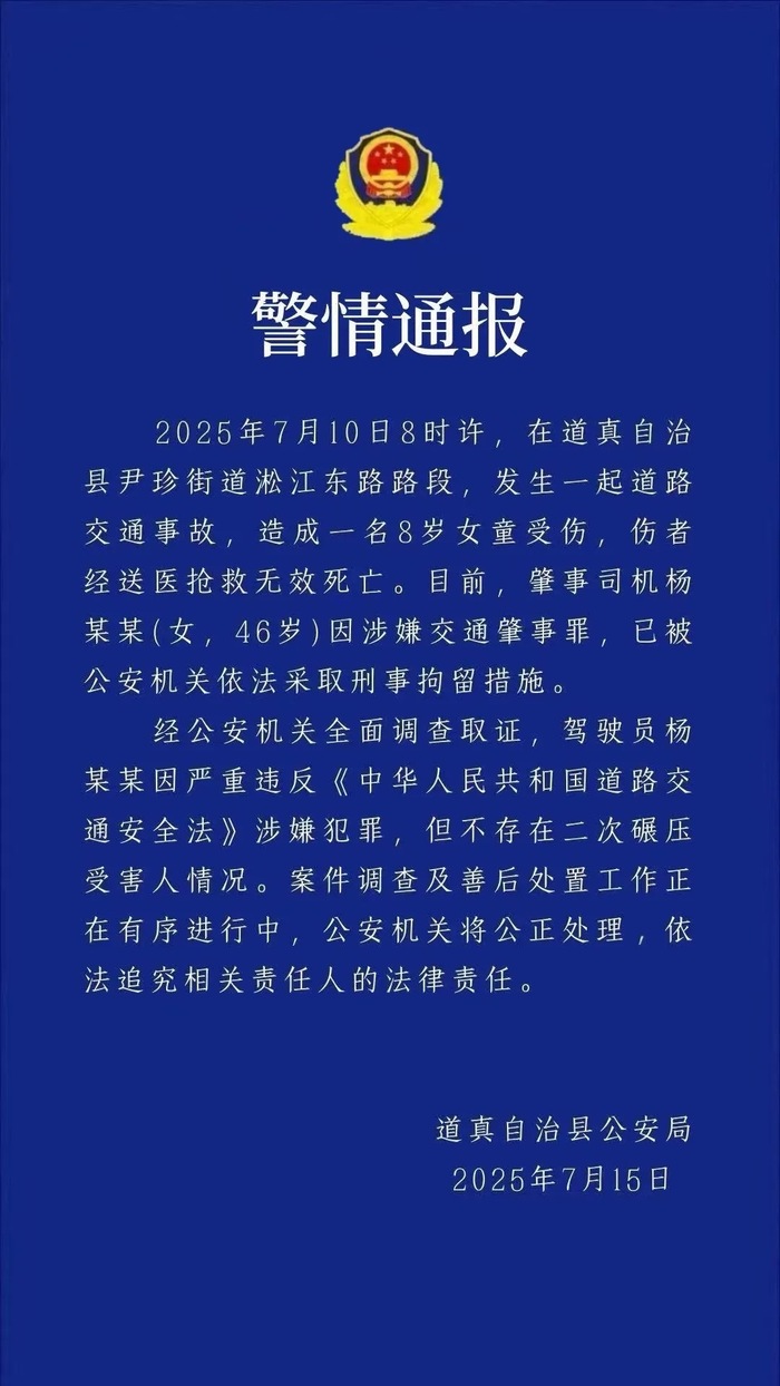 7月15日,贵州省遵义市道真自治县公安局发布警情通报称,7月10日8时许,在道真自治县尹珍街道淞江东路路段,发生一起道路交通事故,造成一名8岁女童受伤,伤者经送医抢救无效死亡。日前,肇事司机杨某某(女,46岁)因涉嫌交通肇事罪,已被公安机关依法采取刑事拘留措施。