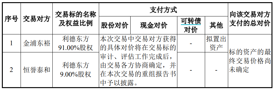 根据公告,金浦钛业拟以持有的南京钛白、徐州钛白、金浦供应链对应的部分资产及全部负债与金浦东裕持有的利德东方91%股权等值部分进行置换。同时,金浦钛业拟向金浦东裕、恒誉泰和发行股份及支付现金,购买其持有的利德东方100%股权与置出资产的差额部分。