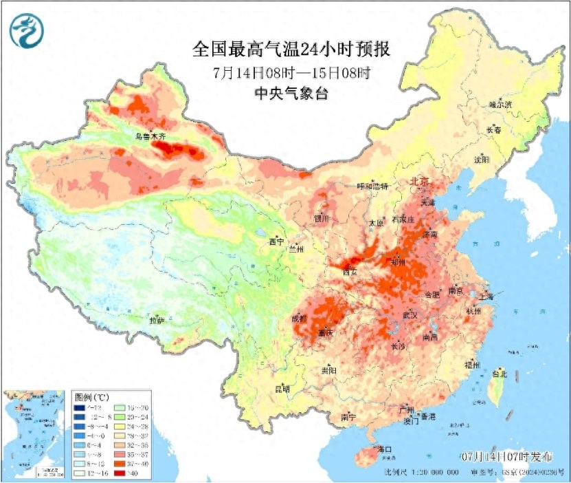 高温方面,未来三天,其影响范围还将保持逐步扩展的状态,15日至16日为高温影响范围最广、强度最强的时段。其中今天,高温将扩展至江南北部,预计华北中南部至江南北部、新疆等地将出现大范围高温天气,河北南部、山东西部、河南大部、山西西南部、陕西关中、湖北北部和西部、重庆大部、四川东部、湖南北部及新疆吐鲁番盆地等地部分地区最高气温有37~39℃,陕西关中、河南中部、新疆吐鲁番盆地等局地可达40℃以上。明后两天,日最高气温可达37℃以上的范围涉及黄淮至江南的大片区域,部分地区气温可超过40℃。