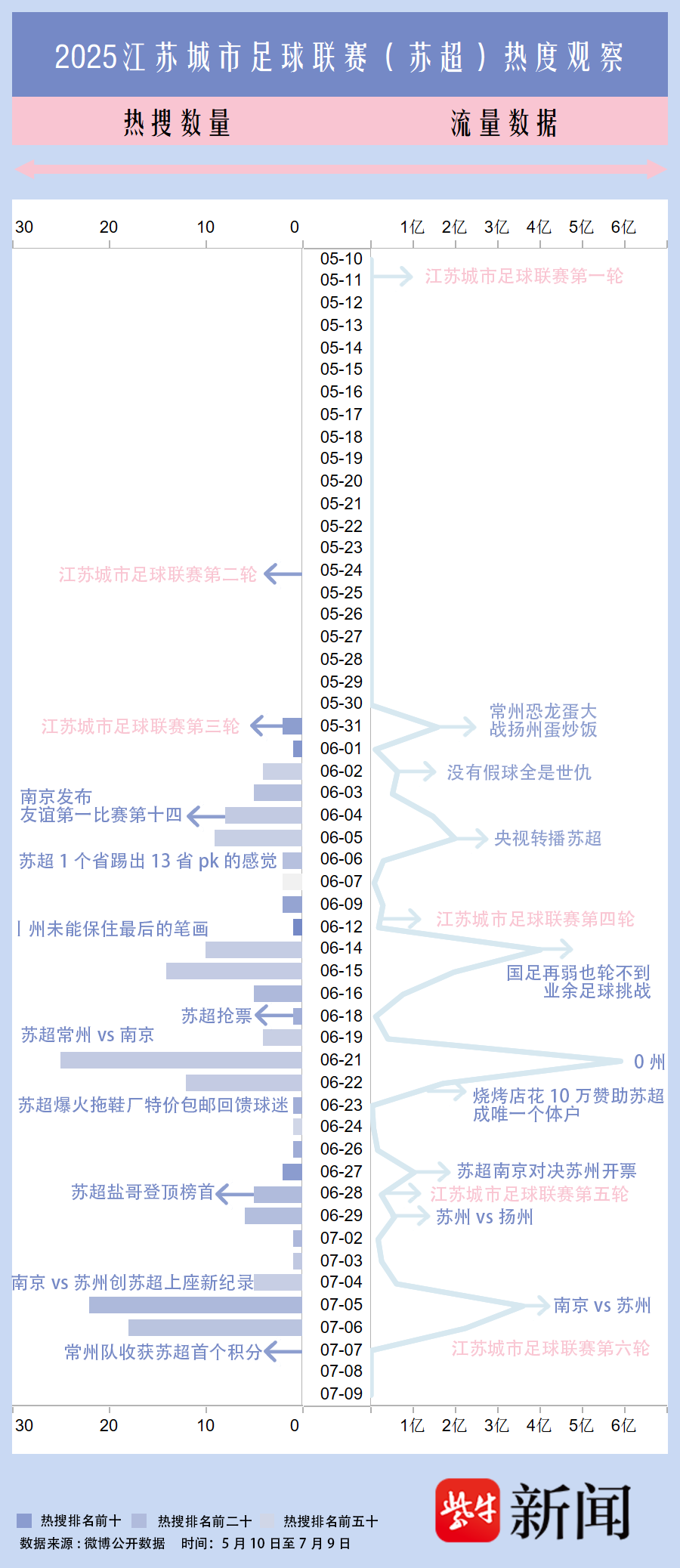 记者梳理了自5月10日苏超开赛以来,所有在榜时间超过半小时的热搜,将这些话题的内容、阅读量、排名等多个纬度数据收集,以时间为轴线,通过多种方式叠加呈现。把全国网友在互联网上的注意力行为,通过数据可视化的方式清晰地呈现,也定格了苏超“来时的路”。
