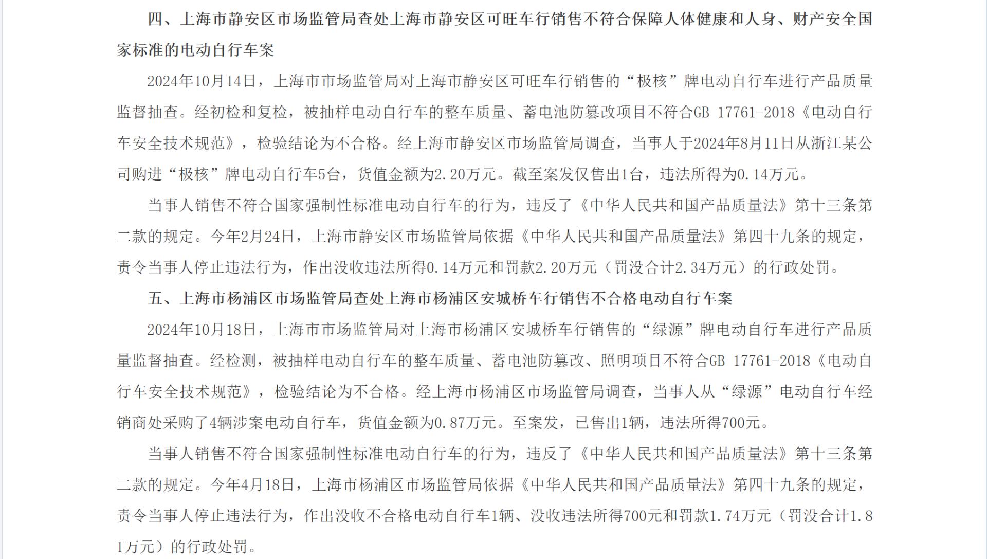 每年的7月至9月向来是电动自行车的销售旺季。而就在7月6日,国家市场监管总局官网上曝光了一批产品质量领域“内卷式”竞争违法典型案例,其中“绿源”“极核”牌电动自行车赫然在列。