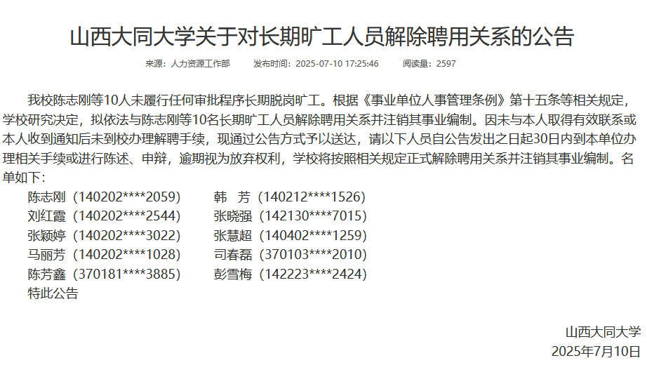 山西大同大学近日发布关于对长期旷工人员解除聘用关系的公告。