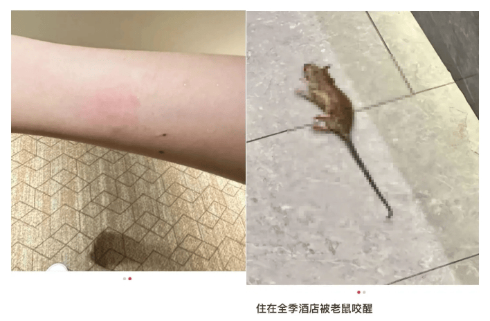 7月9日,家住湖南长沙的网友@吉吉国王 发帖称,自己周末前往江西南昌看演唱会,7月6日入住了全季酒店八一广场青山湖西店,凌晨两点多手臂剧痛,打电话喊前台派人来查看,发现房间内有一只大老鼠。