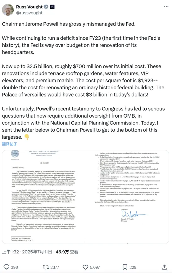 美国管理和预算办公室(OMB)主任罗素·沃特在推文中对鲍威尔进行了猛烈抨击,并附上了他写给鲍威尔的一封信。