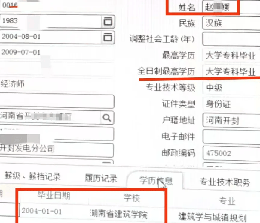 陆女士还反映,倪某晨的妻子、同在开封发电分公司任职的赵某媛也涉嫌学历问题。据陆女士提供的赵某媛个人情况登记,其毕业于“湖南省建筑学院”建筑学与城镇规划专业,全日制最高学历为专科,但毕业日期却标注为“2004年1月1日”。记者向湖南省招生办核实,工作人员表示在现有资料中未能查到“湖南省建筑学院”这所学校。