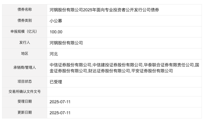 深交所项目进度信息显示,河钢股份有限公司100亿元小公募债项目状态更新为“已受理”,更新日期为2025年7月11日。募集说明书申报稿显示,本次债券注册总额不超过100亿元(含100亿元),采取分期发行。本次债券的募集资金在扣除发行费用后,将用于生产性支出,具体包括偿还债务、补充流动资金、项目投资、股权投资或资产收购等符合国家法律法规要求的用途,具体用途根据发行人资金需求情况确定。