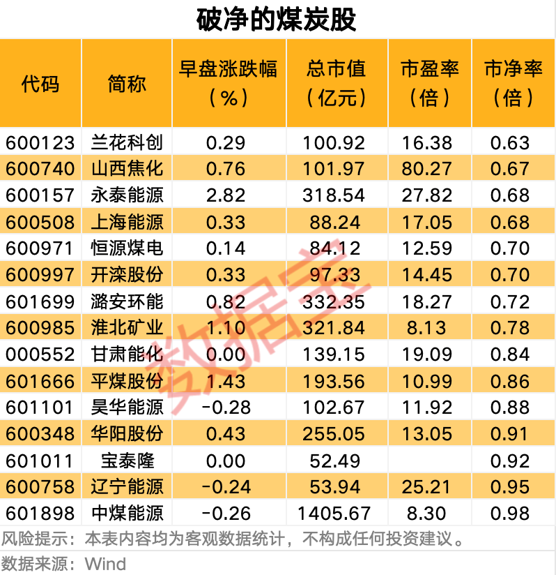 据证券时报·数据宝统计,目前15只煤炭股最新市净率均不足1倍,处于破净状态。从细分领域来看,破净股中焦煤板块个股数量最多,共有9只,动力煤、焦炭分别有4只、2只。