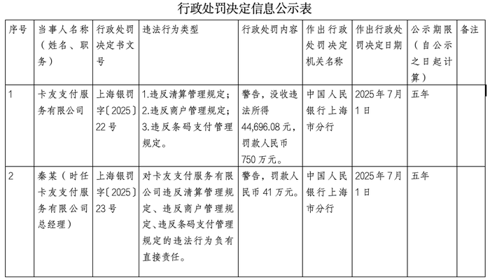 7月10日,中国人民银行上海市分行行政处罚信息公示表显示,2025年7月1日,卡友支付服务有限公司因违反清算管理规定、违反商户管理规定、违反条码支付管理规定,被处警告,没收违法所得44,696.08元,罚款人民币750万元。