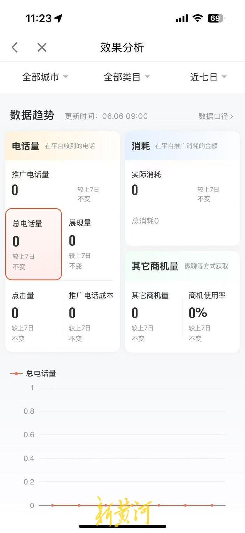 经营图文广告公司的徐先生告诉记者,自己在2024年12月花费3990元购买“生活网邻通”产品后,其店铺点击量与推广电话量连续数月为零,至2025年6月,业务实际咨询量仅为1,成交量为0。