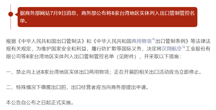中国商务部9日宣布将8家台湾地区实体列入出口管制管控名单,禁止向其出口两用物项。老司机仔细查了一下,这些台湾实体几乎覆盖了所有台军自制装备的生产单位,涉及台湾各军种的先进装备。可以说,台军未来装备的研制发展之路,基本被卡死了。
