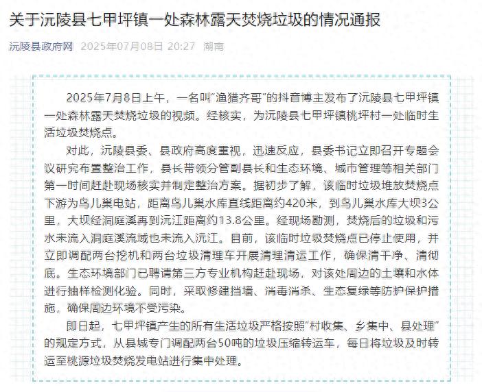 7月8日晚,湖南省沅陵县政府网官微发布《关于沅陵县七甲坪镇一处森林露天焚烧垃圾的情况通报》。