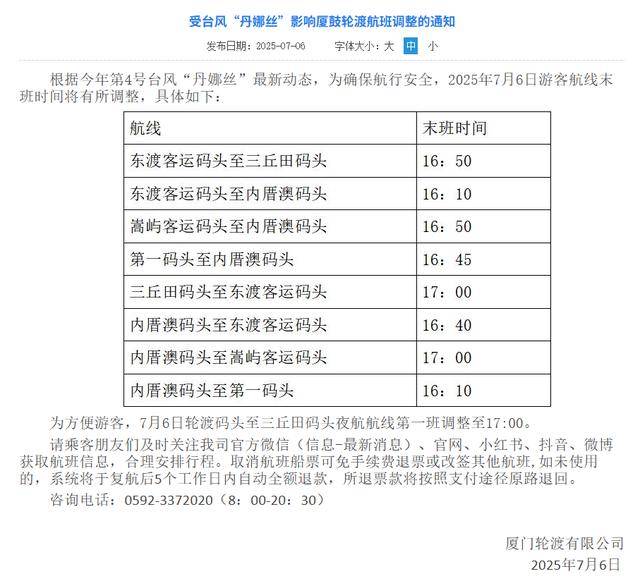 记者搜索发现,厦门轮渡有限公司在7月5日曾通过官网、社交平台等发布“7月6日下午可能停航”的温馨提示,其中提到“如7月6日上午风力达到管控等级,将及时停航”。7月6日下午2点左右,该公司再度发布《受台风“丹娜丝”影响夏鼓轮渡航班调整的通知》,调整了当天游客航线末班时间。
