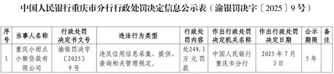 近日,中国人民银行重庆市分行最新公布的行政处罚信息显示,重庆小雨点小额贷款有限公司(简称“小雨点小贷”)因违反信用信息采集、提供、查询相关管理规定,被处以249.1万元的罚款。与此同时,时任小雨点小贷风控中心首席风控官曹某,对该公司的违法违规行为负有责任,被处以14.2万元罚款,处罚公示期限均达五年。