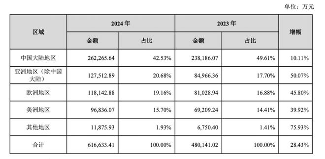 具体来看,绿联去年国内收入同比增长10.11%至26.3亿元,但营收占比较上年同期下降7.08个百分点。而海外市场营收则主要来自亚洲(除中国大陆)、欧洲和美洲三大地区,分别达12.75亿元、11.81亿元、9.68亿元,占比总营收的20.68%、19.16%、15.7%。