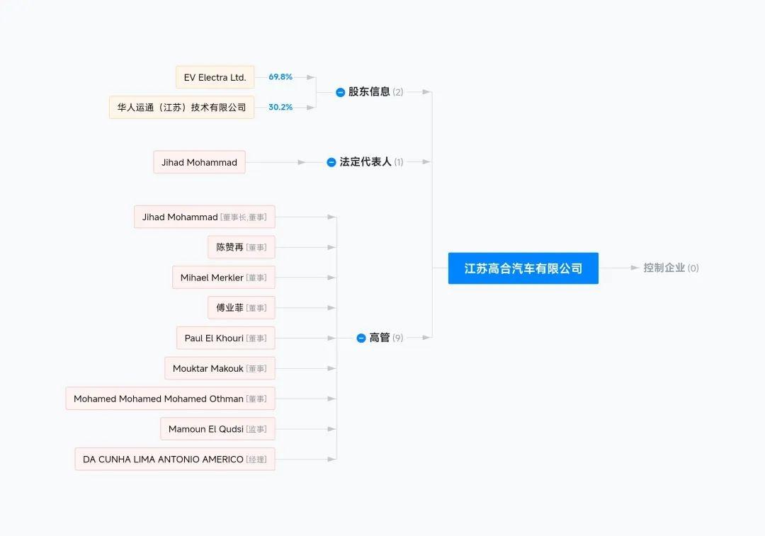 5月22日,一家名为江苏高合汽车有限公司新合资公司注册成立,EV Electr认缴1亿美元持有69.8%的股份,剩余股份由华人运通(江苏)技术有限公司(高合汽车生产主体)持有。