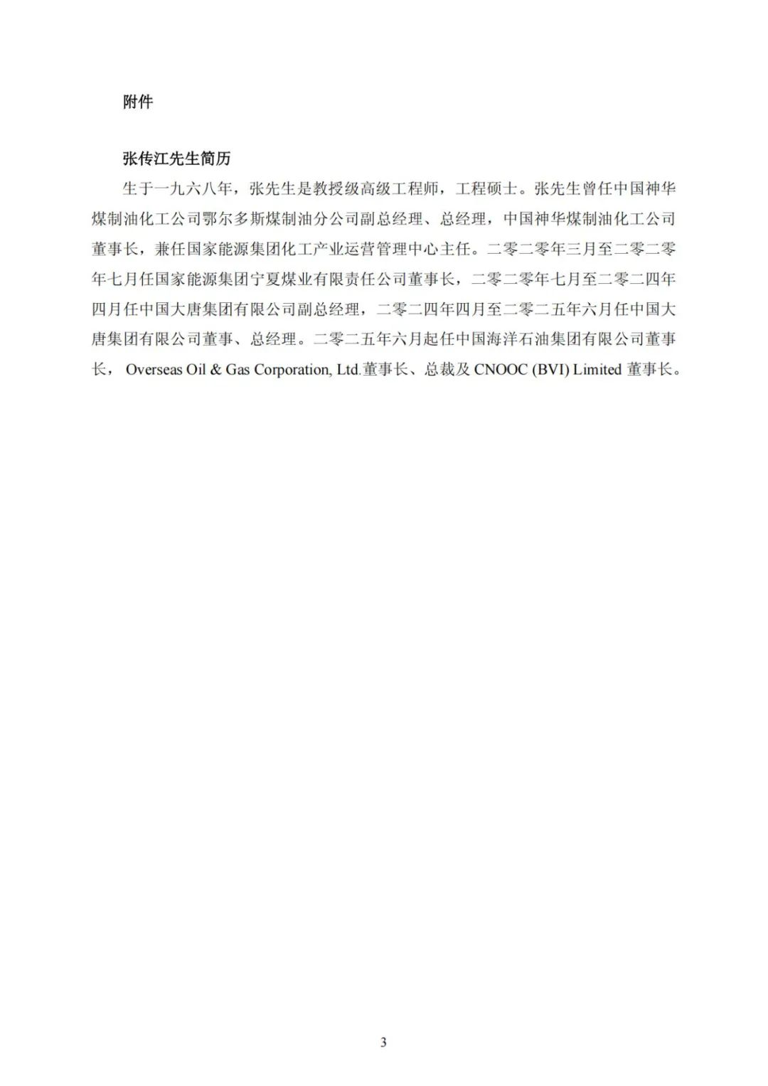 7月8日,中国海洋石油有限公司发布公告称,公司董事会宣布,自2025年7月8日起,张传江获委任为公司董事长、非执行董事、提名委员会主席及战略与可持续发展委员会主席。张传江将任职至公司2025年度股东周年大会召开之日,且将有资格于该股东周年大会上参与重选。
